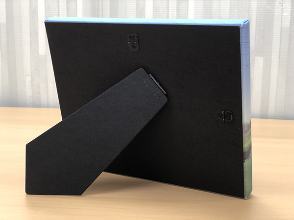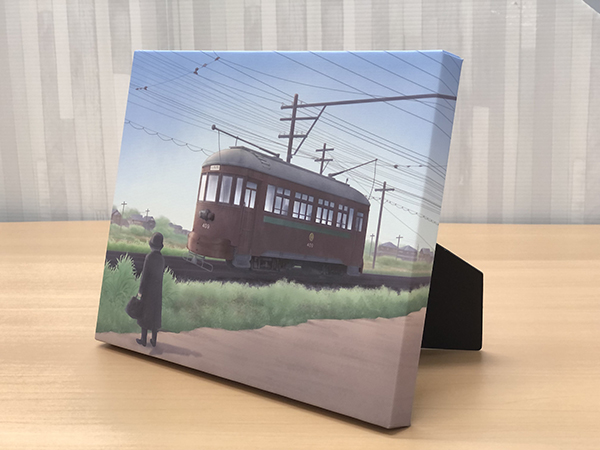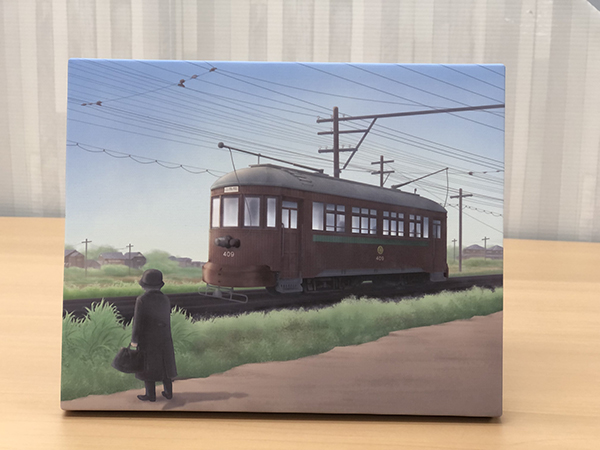 絵のモチーフは晩年を北区王子で過ごした渋沢栄一翁が、自らの資金援助で開通させた王子電車を見守るイメージ画です。この地域は、昭和初期はまだ東京の郊外で野原が広がり、住宅も点在する程度でした。当時の写真等をもとにノスタルジックなイラスト調に仕上げてキャンバス地にプリントし、軽量のクリックフレームにはめこみました。背面にはスタンドと金具を付けて、机に置いたり、壁に掛けて飾って楽しめる様にしました。